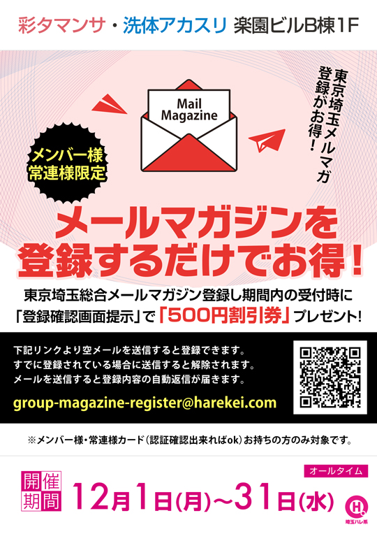 東京埼玉総合メールマガジン登録し期間内の受付時に「登録確認画面提示」で「500円割引券」プレゼント!