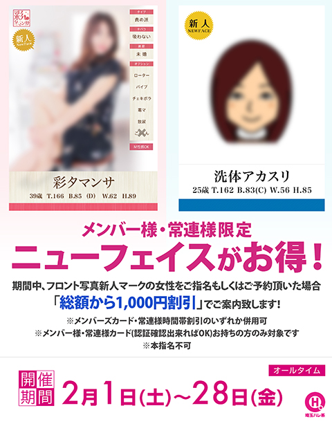 期間中、フロント写真新人マークの女性をご指名もしくはご予約頂いた場合「総額から1,000円割引」でご案内致します!