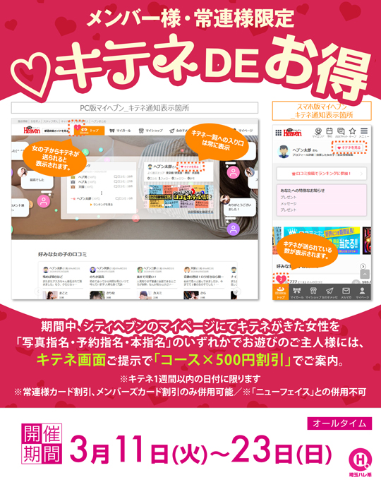 期間中、シティヘブンのマイページにてキテネがきた女性を「写真指名・予約指名・本指名」のいずれかでお遊びのご主人様には、キテネ画面ご提示で「コース×500円割引」でご案内。
