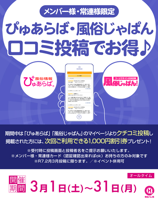 期間中は「ぴゅあらば」「風俗じゃぱん」のマイページよりクチコミ投稿し掲載された方には、次回ご利用できる1,000円割引券プレゼント!
