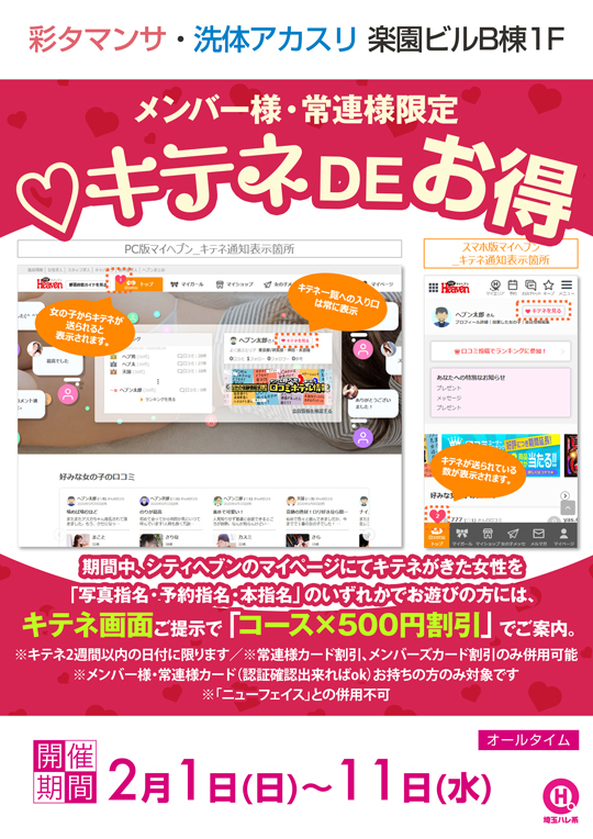 期間中、シティヘブンのマイページにてキテネがきた女性を「写真指名・予約指名・本指名」のいずれかでお遊びの方には、キテネ画面ご提示で「コース×500円割引」でご案内。